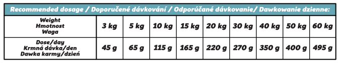 Podawaj granulki w zależności od kondycji zwierzęcia, zapewniając mu dostęp do świeżej wody. Nie używaj miarek do paszy ekstrudowanej do dawkowania, ponieważ pasza tłoczona na zimno jest znacznie cięższa – kieruj się wagą (patrz tabela orientacyjna). Przechowywać w chłodnym, suchym miejscu, z dala od bezpośredniego światła słonecznego.