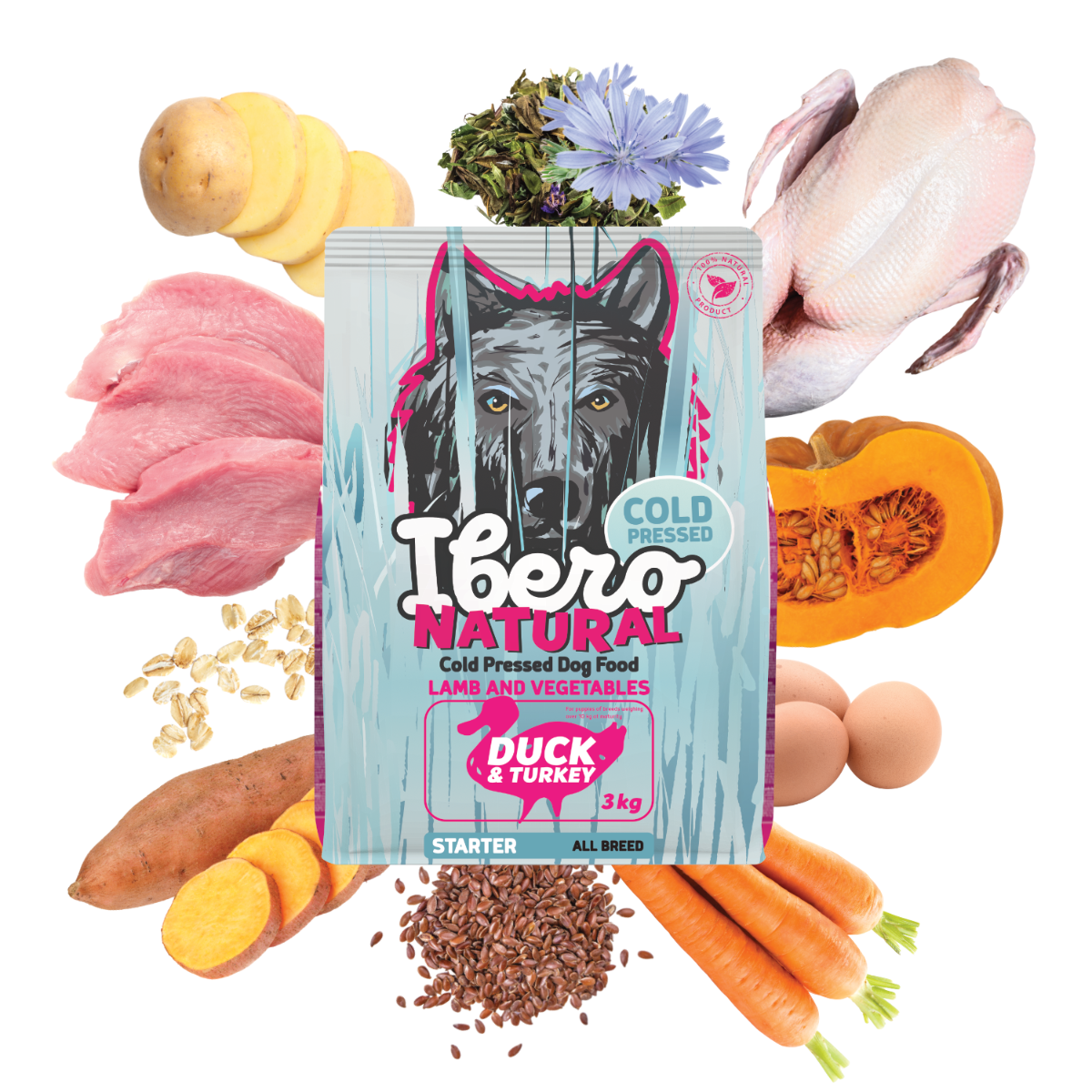 Karma Ibero Cold Pressed Starter Turkey & Duck to kompleksowa i wysoce odżywcza receptura opracowana specjalnie z myślą o potrzebach najmłodszych szczeniąt. Bazą jest 39% suszonego mięsa z indyka i kaczki, uzupełnione 13% wysoko oczyszczonego białka z indyka , które razem zapewniają optymalną ilość wysokiej jakości białka niezbędnego dla zdrowego wzrostu, rozwoju mięśni i prawidłowego funkcjonowania układu odpornościowego. Bataty, ziemniaki, płatki owsiane, dynia i marchew stanowią naturalne źródła energii, błonnika i przeciwutleniaczy. Proszek jajeczny dostarcza wysoce wartościowego biologicznie białka. Siemię lniane, ekstrakt z cykorii i suszone zioła harmonizują trawienie i wspierają zdrowie jelit. Beta-glukany wzmacniają naturalne mechanizmy obronne organizmu w newralgicznym okresie wczesnego rozwoju. Glukozamina i siarczan chondroityny wspomagają prawidłowy rozwój stawów i chrząstki. Dzięki technologii tłoczenia na zimno karma zachowuje swój naturalny smak i wysoką wartość odżywczą. Granulki są gęste, bardzo lekkostrawne i nie zwiększają objętości w żołądku, co zapewnia bezpieczne i komfortowe trawienie. Karma Ibero Cold Pressed Starter Turkey & Duck to w 100% naturalna karma bez sztucznych konserwantów, barwników i GMO. Jest idealnym wyborem na zdrowy start w życie dla szczeniąt wszystkich ras.