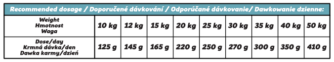 Podawaj granulki w zależności od kondycji zwierzęcia, zapewniając mu dostęp do świeżej wody. Nie używaj miarek do paszy ekstrudowanej do dawkowania, ponieważ pasza tłoczona na zimno jest znacznie cięższa – kieruj się wagą (patrz tabela orientacyjna). Przechowywać w chłodnym, suchym miejscu, z dala od bezpośredniego światła słonecznego.