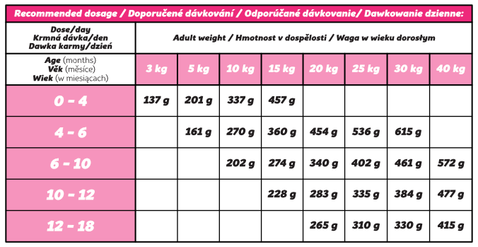 Podawaj granulki w zależności od kondycji zwierzęcia, zapewniając mu dostęp do świeżej wody. Nie używaj miarek do paszy ekstrudowanej do dawkowania, ponieważ pasza tłoczona na zimno jest znacznie cięższa – kieruj się wagą (patrz tabela orientacyjna). Przechowywać w chłodnym, suchym miejscu, z dala od bezpośredniego światła słonecznego.