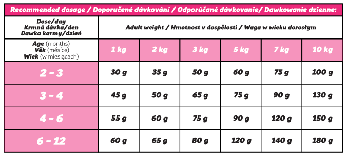 Podawaj granulki w zależności od kondycji zwierzęcia, zapewniając mu dostęp do świeżej wody. Nie używaj miarek do paszy ekstrudowanej do dawkowania, ponieważ pasza tłoczona na zimno jest znacznie cięższa – kieruj się wagą (patrz tabela orientacyjna). Przechowywać w chłodnym, suchym miejscu, z dala od bezpośredniego światła słonecznego.