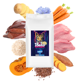 Ibero Grain-free Cat Adult Turkey to wysokiej jakości, smaczna i zbilansowana odżywczo karma dla dorosłych kotów wszystkich ras. Receptura oparta jest na 40% suszonego mięsa z indyka , które jest łatwostrawnym i naturalnie smacznym źródłem białka zwierzęcego, szanując naturalne potrzeby kotów jako bezwzględnych mięsożerców. Mięso z indyka w połączeniu z tłuszczem z indyka zapewnia optymalne spożycie energii, wsparcie masy mięśniowej i doskonałą smakowitość karmy. Bataty, ziemniaki, dynia i marchew dostarczają błonnika, witamin i minerałów, które wspomagają zdrowe trawienie i ogólną kondycję. Siemię lniane, babka płesznik i ekstrakt z cykorii przyczyniają się do równowagi mikroflory jelitowej i prawidłowego funkcjonowania przewodu pokarmowego . Dodatek tauryny w optymalnych ilościach wspiera zdrowie serca, wzroku i układu nerwowego . Karma jest w 100% naturalna, wolna od zbóż, GMO, sztucznych konserwantów i barwników, odpowiednia do długotrwałego karmienia jako kompletne i funkcjonalne pożywienie dla dorosłych kotów.