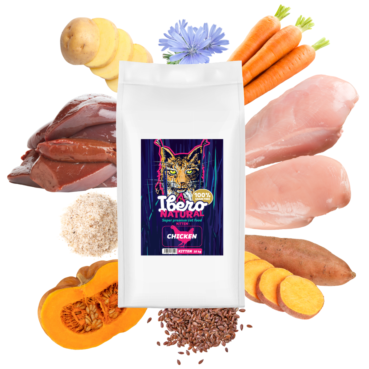 Ibero Grain-free Cat Kitten Chicken to wysokiej jakości, bogata w składniki odżywcze karma przeznaczona dla kociąt w okresie intensywnego wzrostu oraz dla kotek ciężarnych i karmiących. Podstawą receptury jest 40% suszonego mięsa z kurczaka , które dostarcza wysokostrawnych białek zwierzęcych, niezbędnych do budowy masy mięśniowej, prawidłowego rozwoju kości i ogólnej witalności. Wyższa zawartość tłuszczu z kurczaka zapewnia wystarczającą ilość energii dla szybkiego wzrostu kociąt i pokrywa zwiększone zapotrzebowanie energetyczne matek. Bataty, ziemniaki, dynia i marchew dostarczają błonnika, witamin i minerałów dla zdrowego trawienia i prawidłowego funkcjonowania organizmu. Siemię lniane, babka płesznik i ekstrakt z cykorii wspierają równowagę mikroflory jelitowej i przyczyniają się do dobrej tolerancji pokarmowej. Beta-glukany wzmacniają układ odpornościowy i pomagają w budowie naturalnych mechanizmów obronnych od najmłodszych lat. Tauryna zawarta w optymalnych ilościach zapewnia zdrowy rozwój wzroku, serca i układu nerwowego. Karma jest w 100% naturalna, wolna od zbóż, GMO, sztucznych barwników i konserwantów, nadaje się do długotrwałego karmienia jako pełnowartościowe pożywienie.