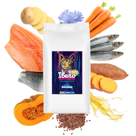 SKŁAD: Suszony łosoś 29%, słodkie ziemniaki, suszone ziemniaki, olej z łososia 13%, suszone sardynki 11%, suszona dynia, suszone marchewki 1,2%, siemię lniane, ekstrakt z cykorii, beta-glukany, tauryna, mieszanka witamin i minerałów.