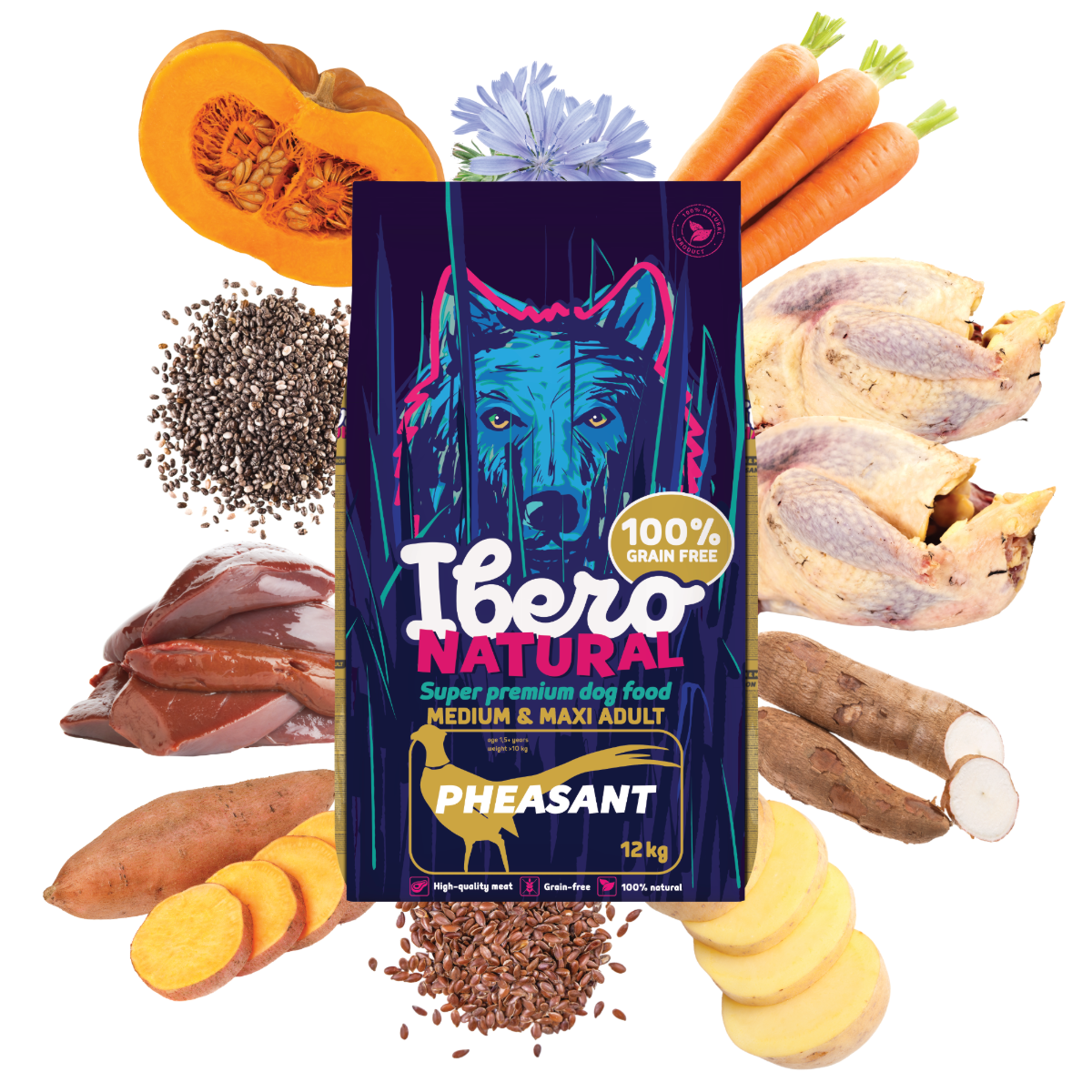 Ibero Grain-free Dog Medium & Maxi Adult Pheasant to unikalna receptura oparta na 29% suszonego mięsa bażanta , które jest jednym z najsmaczniejszych i najbardziej strawnych mięs, odpowiednich nawet dla psów z wrażliwym układem trawiennym. Bażant ma wysoką wartość biologiczną, delikatny smak i jest świetną alternatywą dla psów uczulonych na kurczaka lub wołowinę. Karma jest uzupełniona o bataty, ziemniaki, dynię i marchew , które dostarczają wysokiej jakości energii, naturalnego błonnika i wspierają zdrowe trawienie. Nasiona chia, siemię lniane i ekstrakt z cykorii działają synergistycznie na odporność, trawienie, sierść i ogólną witalność. Dodany ekstrakt z chrząstki jest naturalnym źródłem kolagenu, uzupełnionym o glukozaminę i chondroitynę dla prawidłowego funkcjonowania stawów i wsparcia układu mięśniowo-szkieletowego. Receptura jest w 100% naturalna, bez zbóż, sztucznych konserwantów i barwników i nadaje się do długotrwałego podawania jako główne źródło wysokiej jakości, smacznego i łatwo przyswajalnego pożywienia.