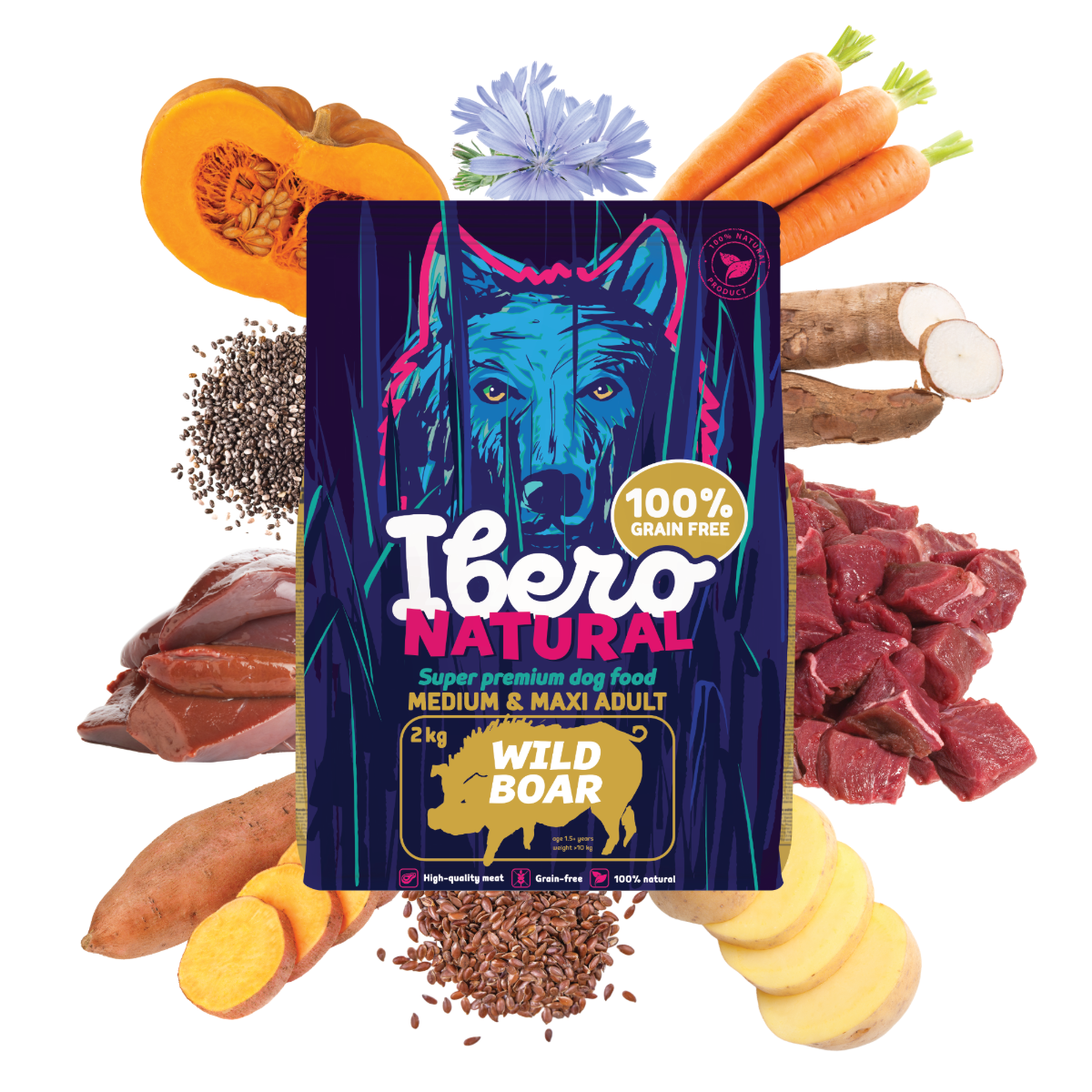Ibero Grain-free Dog Medium & Maxi Adult Wild Boar to pożywna i smaczna receptura stworzona dla dorosłych psów średnich i dużych ras. Podstawą karmy jest 29% suszonego mięsa dzika , które jest wysokiej jakości i naturalnym źródłem białka. Dzik jest bogaty w białko, ma niski potencjał alergizujący i dzięki swojemu charakterystycznemu smakowi jest idealny nawet dla wybrednych psów. Karma jest uzupełniona o bataty, ziemniaki, dynię i marchewkę , które dostarczają naturalnych witamin, minerałów, błonnika i wspomagają zdrowe trawienie. Nasiona chia, siemię lniane i ekstrakt z cykorii przyczyniają się do witalności, zdrowego trawienia i wysokiej jakości sierści. Dla długotrwałego wsparcia układu mięśniowo-szkieletowego receptura zawiera glukozaminę, chondroitynę i ekstrakt z chrząstki , które pomagają chronić stawy i wspierają ich elastyczność. Karma jest w 100% naturalna, wolna od GMO, sztucznych konserwantów i zbóż. Nadaje się do długotrwałego podawania jako główne źródło wysokiej jakości, funkcjonalnego i smacznego pożywienia.