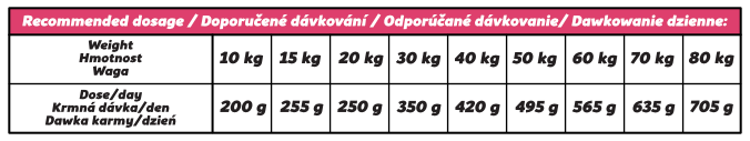 Podawaj psu karmę suchą. Po okresie początkowym podawaj psu dzienne porcje karmy, zgodnie z wagą psa podaną w tabeli. Zalecana dzienna porcja karmy ma charakter orientacyjny. Jeśli pies ma nadwagę, zmniejsz dzienną porcję karmy o 10%. Jeśli pies traci na wadze, zwiększ dzienną porcję karmy o 10%. Zapewnij psu dostęp do świeżej wody pitnej. Przechowuj w chłodnym i ciemnym miejscu.