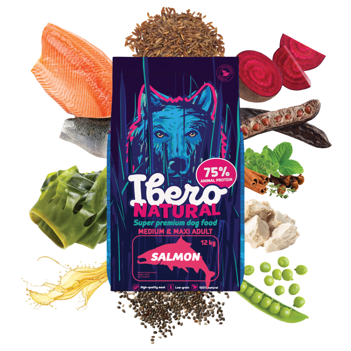 Ibero Natural Salmon to zbilansowana i funkcjonalna receptura super-premium, opracowana w celu pełnego pokrycia potrzeb żywieniowych dorosłych psów średnich i dużych ras. Podstawą karmy jest 38% suszonego mięsa i ryb, w tym łosoś, który dostarcza wysokiej jakości i łatwo przyswajalnych białek zwierzęcych, niezbędnych do utrzymania masy mięśniowej i ogólnej witalności. Pełnoziarnisty ryż, groch i starannie wyselekcjonowane źródła błonnika zapewniają stabilną energię bez zbędnego obciążenia układu pokarmowego. Olej z łososia, nasiona chia i wodorosty wspierają zdrową skórę, lśniącą sierść i prawidłowe funkcjonowanie organizmu. Prebiotyki MOS i FOS wraz z drożdżami i ekstraktami roślinnymi harmonizują trawienie i wzmacniają układ odpornościowy. Receptura wzbogacona jest glukozaminą i siarczanem chondroityny dla długotrwałej ochrony stawów i układu mięśniowo-szkieletowego. Naturalne przeciwutleniacze z olejów roślinnych i ekstraktów ziołowych pomagają chronić komórki przed stresem oksydacyjnym. Ibero Natural Salmon to w 100% naturalna karma super premium, która jest niezawodnym wyborem w zakresie codziennego, wysokiej jakości i długoterminowego żywienia dorosłych psów średnich i dużych ras.