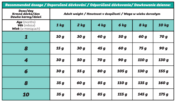 Dla jakich psów jest odpowiedni: ✔ Dla szczeniąt ras miniaturowych i małych do 1 roku życia ✔ Dla psów o przewidywanej masie ciała dorosłego do ok. 10 kg ✔ Dla szczeniąt o szybszym metabolizmie i większym zapotrzebowaniu na energię ✔ Dla właścicieli poszukujących super premium, naturalnej i hipoalergicznej karmy