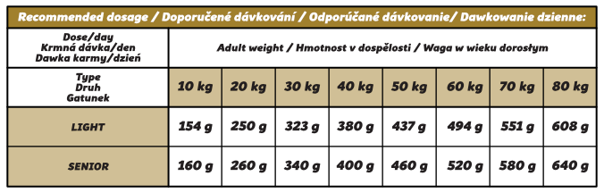 Zalecamy podzielenie dziennej dawki na 2 porcje. Karmę należy podawać na sucho, należy zapewnić psu dostęp do świeżej wody. Indywidualne zapotrzebowanie na składniki odżywcze zależy od takich czynników jak wiek, rasa, aktywność i kondycja fizyczna. Po każdym karmieniu należy upewnić się, że opakowanie jest szczelnie zamknięte i przechowywać w suchym i chłodnym miejscu, z dala od bezpośredniego światła słonecznego.