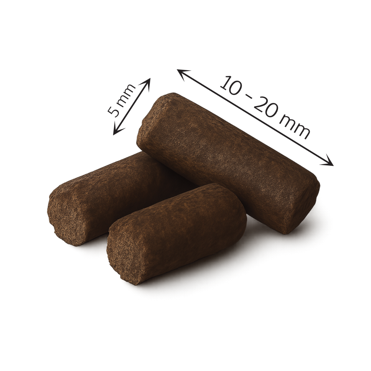 Podawaj granulki w zależności od kondycji zwierzęcia, zapewniając mu dostęp do świeżej wody. Nie używaj miarek do paszy ekstrudowanej do dawkowania, ponieważ pasza tłoczona na zimno jest znacznie cięższa – kieruj się wagą (patrz tabela orientacyjna). Przechowywać w chłodnym, suchym miejscu, z dala od bezpośredniego światła słonecznego.