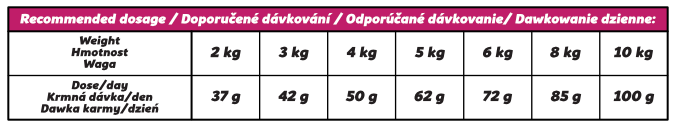 DODATKI (na kg): Witamina A 15 000 IU, witamina D3 1500 IU, witamina E 30 mg, witamina K3 1 mg, witamina B1 2 mg, witamina B2 5 mg, witamina B6 7 mg, witamina B12 0,03 mg, witamina C 1000 mg, niacyna 20 mg, kwas pantotenowy 10 mg, kwas foliowy 0,3 mg, jod 1,5 mg, selen 0,15 mg, żelazo 100 mg, miedź 20 mg, cynk 100 mg, mangan 60 mg, chlorek choliny 900 mg, tauryna 3000 mg. Przeciwutleniacze: bogate w tokoferole ekstrakty z olejów roślinnych.